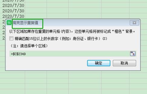 然后在弹出的【高亮显示重复值】中选中区域,单击确定;