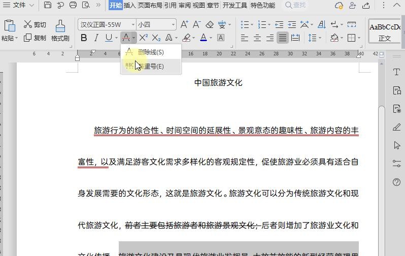 在下拉列表中我们可以看到有删除线以及着重号选项,选择删除线,我们可以对不需要的内容做一个删除标志。