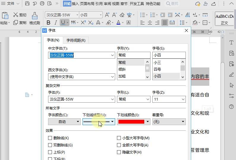 若下拉列表中没有所需样式,可以点击“其他下划线”来选择。
