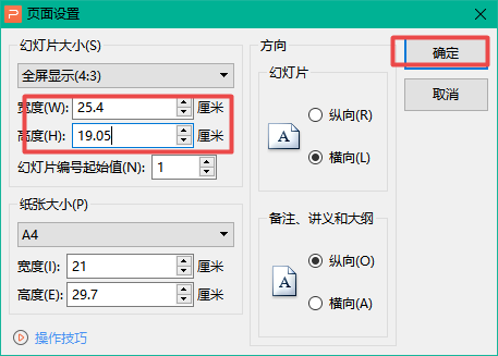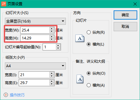 第四步,接着软件就会弹出【页面设置】窗口了,在此界面中,我们可以根据自己的实际需求,来调整PPT的【宽度】和【高度】。