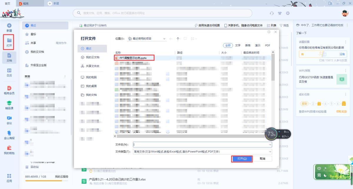 第一步,在电脑的桌面上找到WPS程序,然后双击打开,接着将需要进行处理的PPT文档也同时打开。