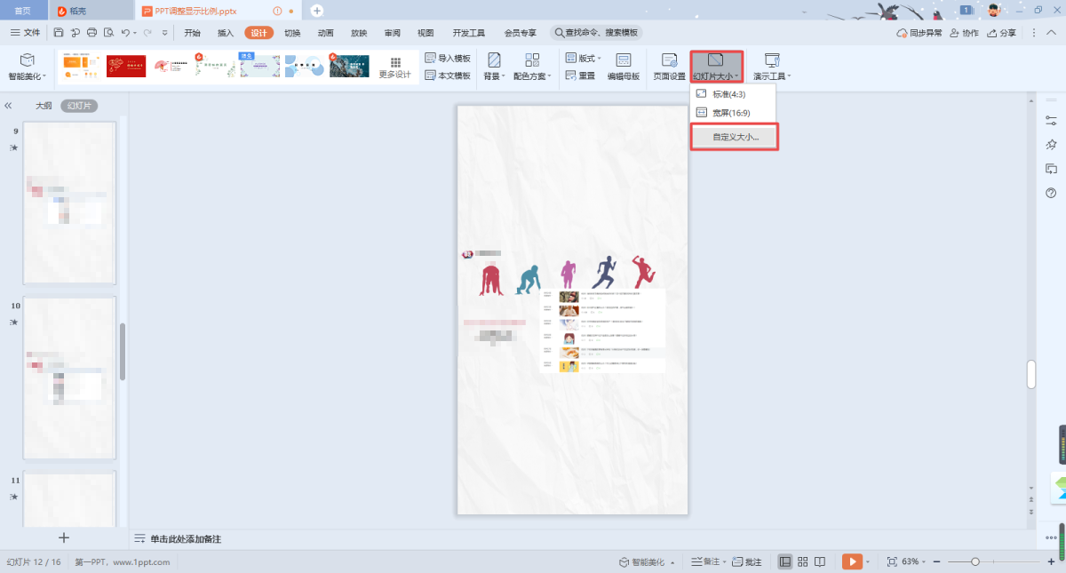 第三步,进入到软件的设计选项卡当中后,我们在其下方的选项中,找到【幻灯片大小】选项,并点击打开,接着在其弹出的选项中,选择【自定义大小】选项。