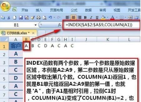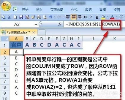 2)单行变单列。和上面的例子一样,我们在A2输入:=INDEX($B$1:$I$1,ROW(A1)),并下拉公式即可。