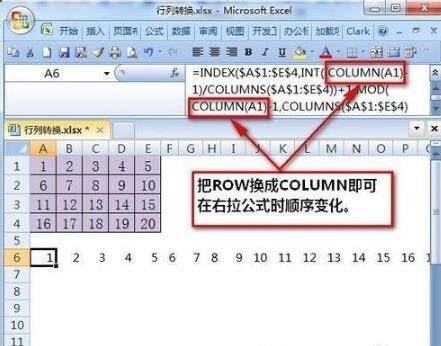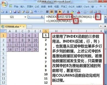 此法是第三、四种方法的逆方法,如下图,要将单列数据变成4行5列的表格,在C1输入公式:=INDEX($A$1:$A$20,(ROW(A1)-1)*5+COLUMN(A1)),右拉5列,下拉4行公式即可完成行列的转换。