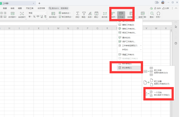 第二步,点击工具栏上的【工作表】选项,并点击最后一个选项【拆分表格】,选择【一个文档拆分成多个文档】。