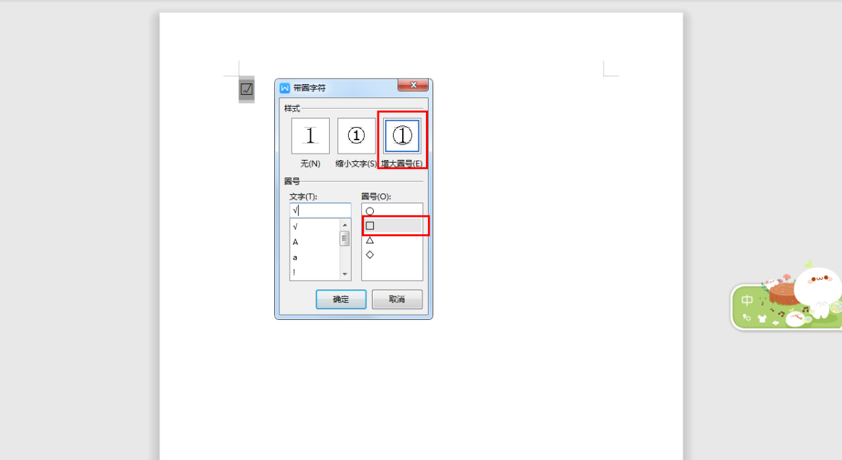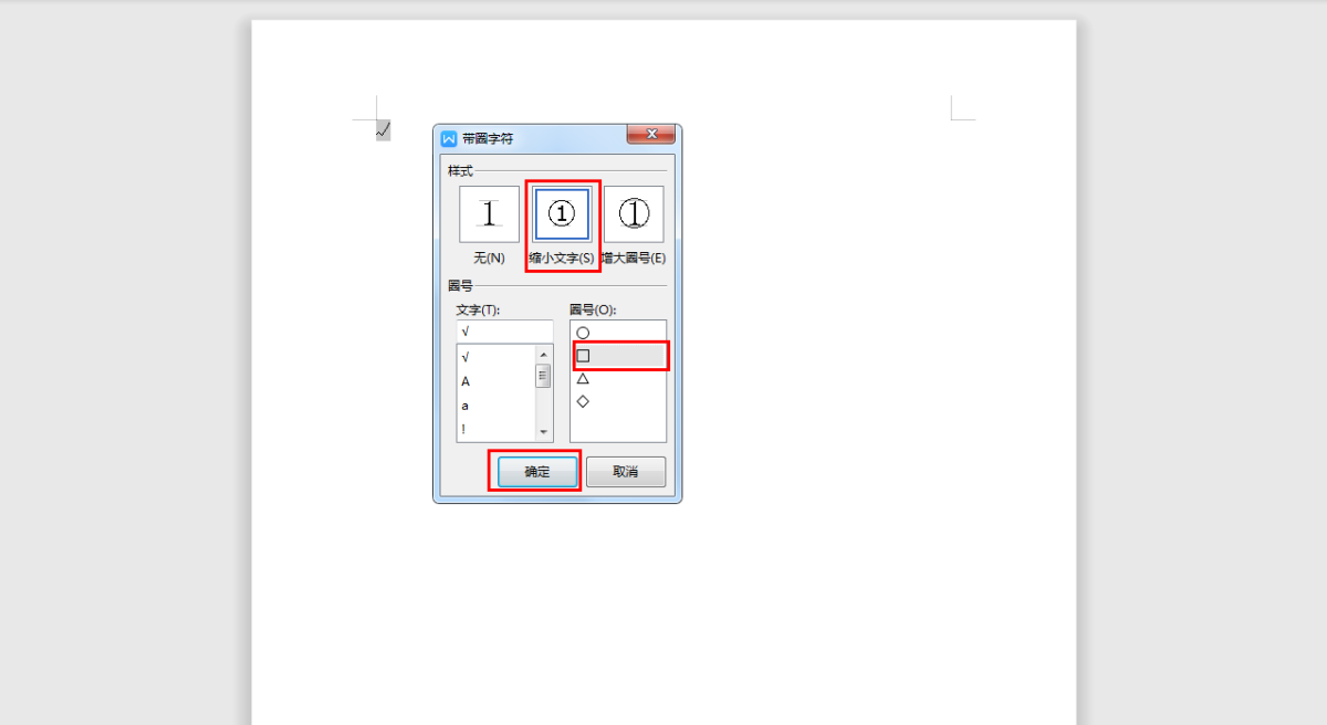 第三步,在弹出的带圈字符窗口中,找到【样式】,然后选择【缩小文字】或者是【增大圈号】都可以。然后在【圈号】选项中,选择【口】,最后点击【确定】按钮就可以了。