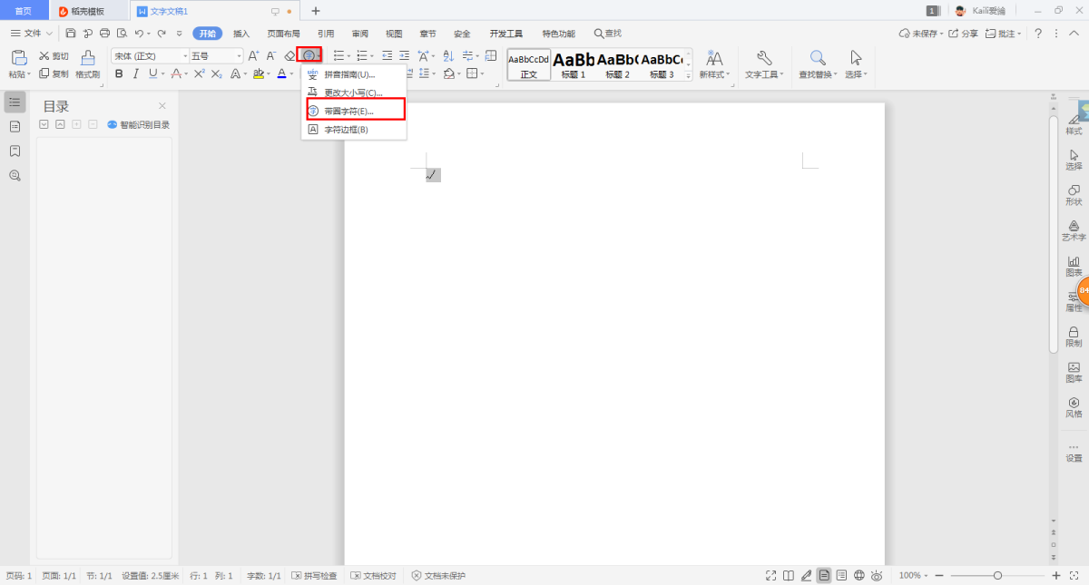 第二步,选中刚刚所输入的“√”,然后在Word的【开始】选项卡当中,找到【字体】命令下的【带圈字符】命令。