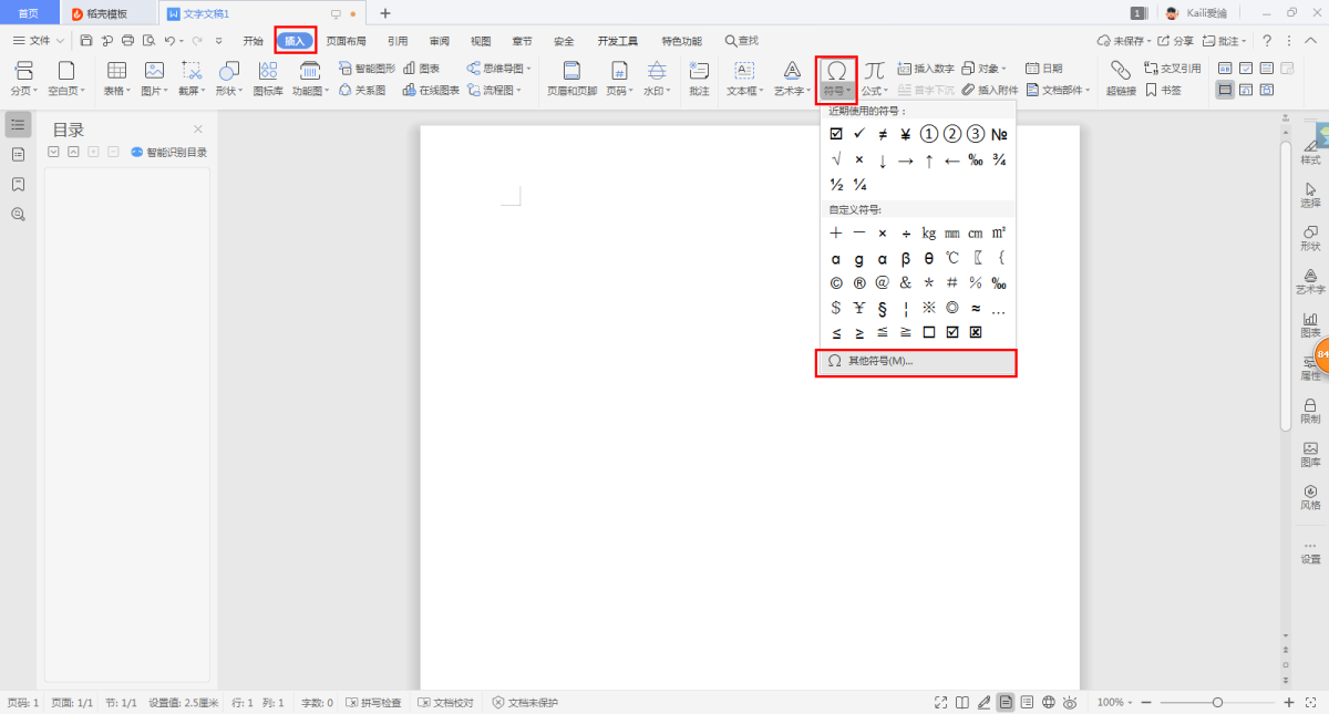 第一步,在Word的【插入】选项卡当中,选择【符号】选项,然后在符号命令的下拉菜单中,选择【其他字符号】命令。