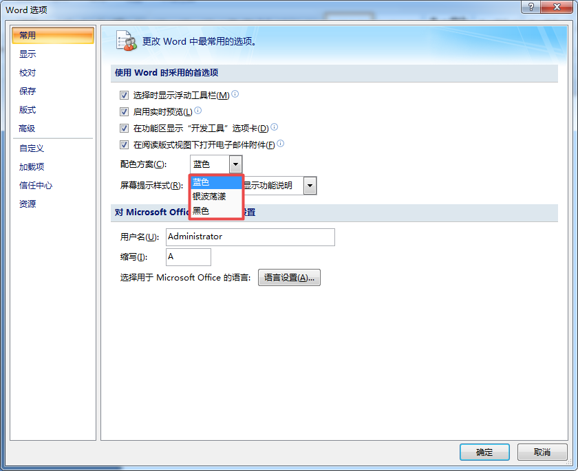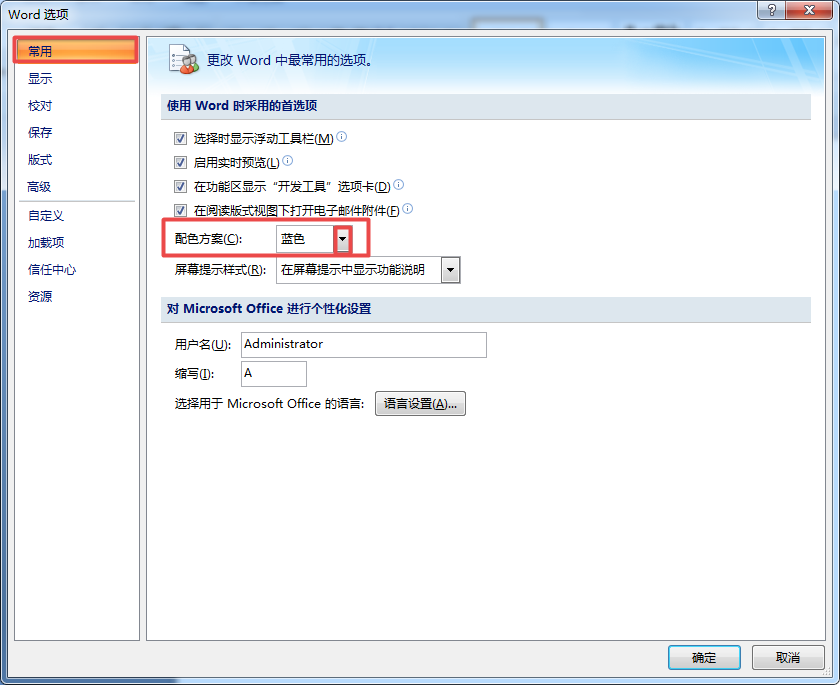 第三步,此时界面就会弹出【Word选项】的设置窗口,我们在此窗口的左侧找到【常用】功能,接着在右侧的界面中,找到【配色方案】选项,此时我们可以看到,软件的主题颜色默认是蓝色的,点击其右侧的【下拉】按钮。