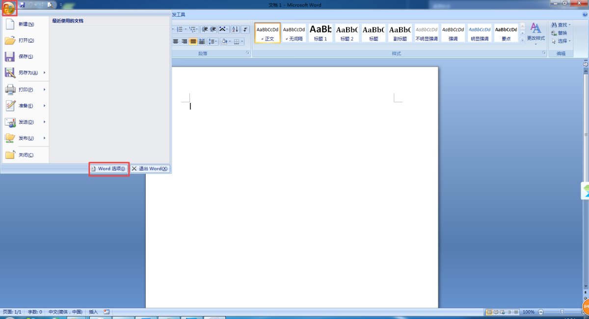 第二步,进入到Word软件的主界面后,我们找到左上角的【开始菜单】按钮,并点击打开,接着在弹出的窗口的右下角位置,找到【Word选项】按钮,并点击进入。
