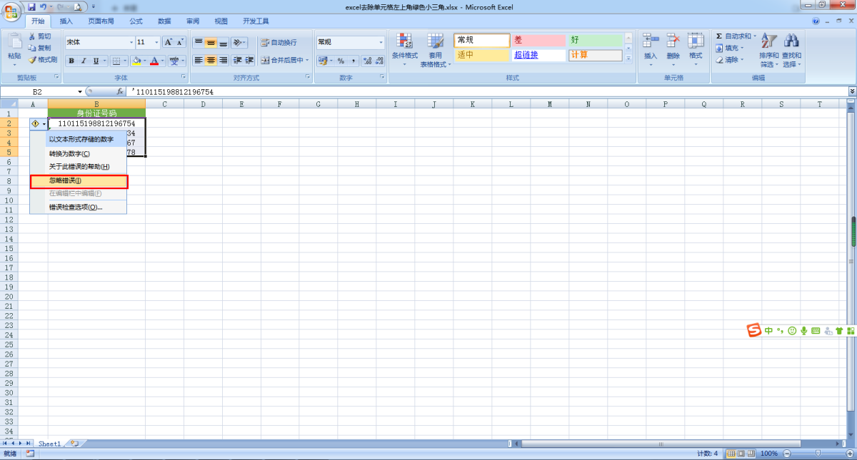 第五步,此时不论我们如何重新编辑原来的单元格,还是在新的单元格当中录入身份证号码,都不会再出现绿色小三角了。
