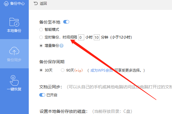 接着在右侧的窗口中,我们选中“定时备份”一项,同时在后面设置好自动定时备份的间隔时间。