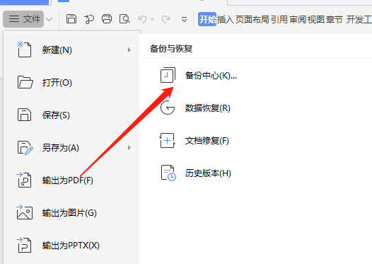 接着在弹出的二级菜单中我们选择“备份中心”的菜单项。