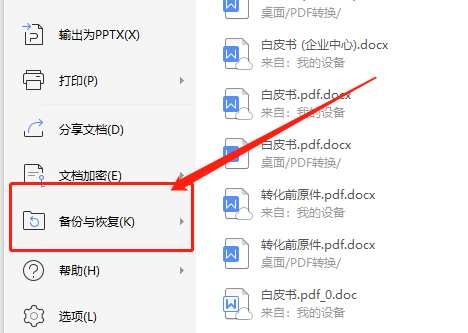 在弹出的文件下拉菜单中我们选择“备份与恢复”的菜单项。