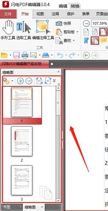 2、打开后PDF文件就会以缩略图的形式显示在软件的左侧,点击缩略图即可打开相应的PDF页面内容。