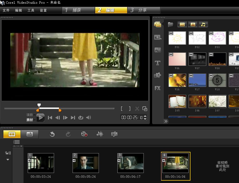 首先单击会声会影预览窗口下方的“播放”按钮,让原视频继续播放(查找下一个区间的起始位置),至适当位置后单击“暂停”按钮,开始设置第二段视频的起始和结束点,完成第二段小视频的剪辑;