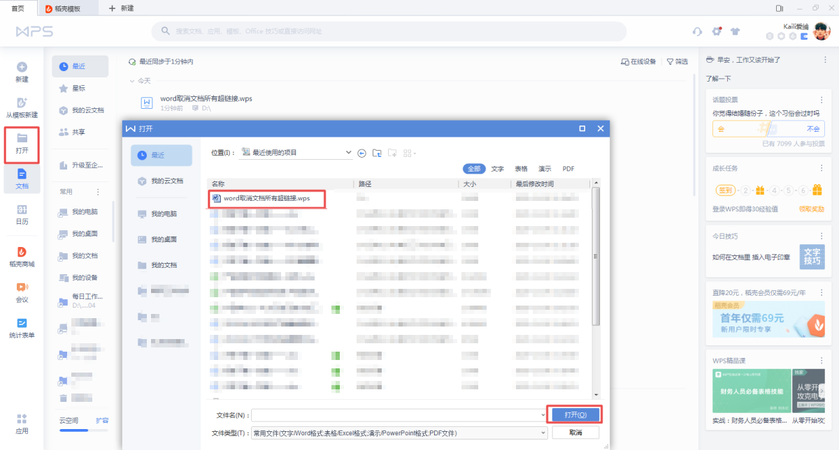 第一步,在电脑的桌面上,找到WPS程序,然后双击打开,接着将需要处理的Word文档打开来。