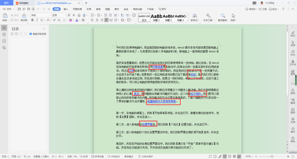 如果此时想要将文档的文字内容整理好,我们就需要将文字的超链接去掉,但是一个一个的去掉的话,又是非常麻烦的,费时又费力。那么我们能不能快速的将文档中的所有超链接全部取消呢?答案当然是肯定的,可以的。