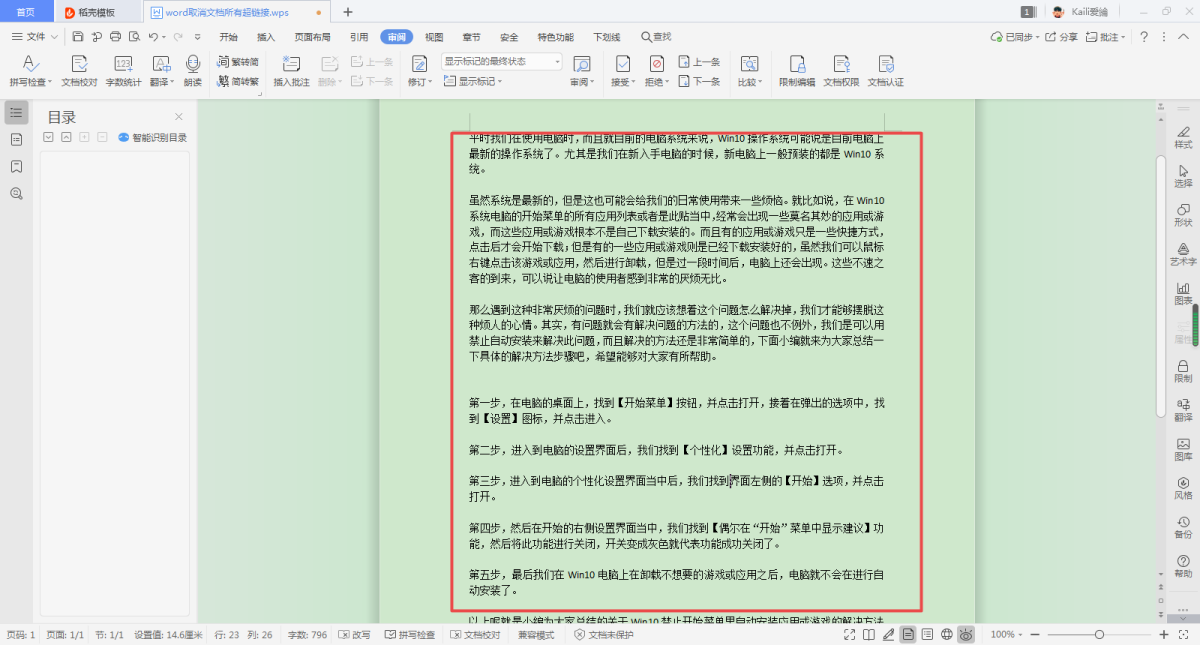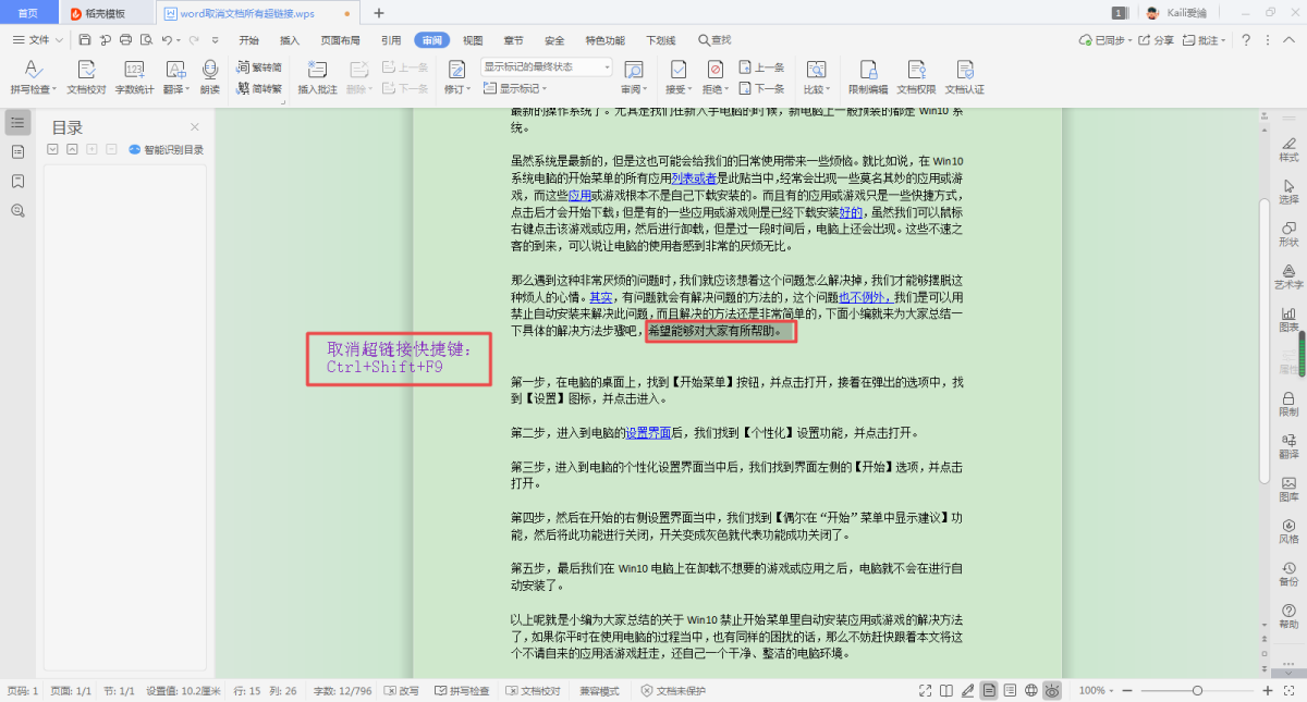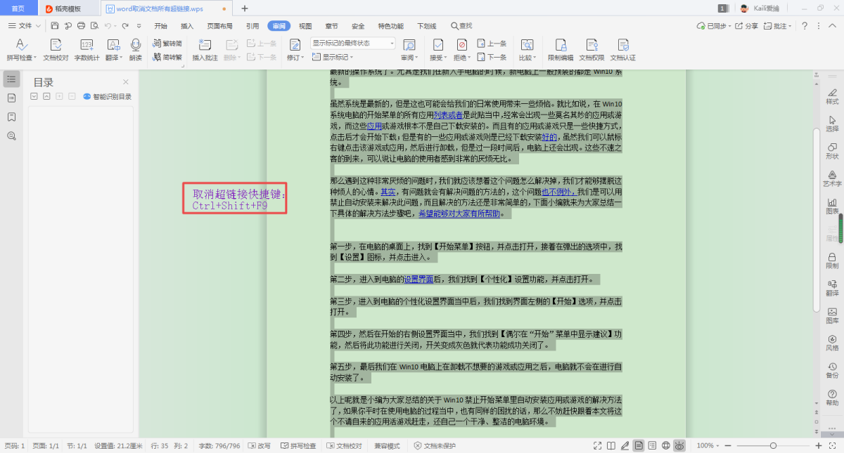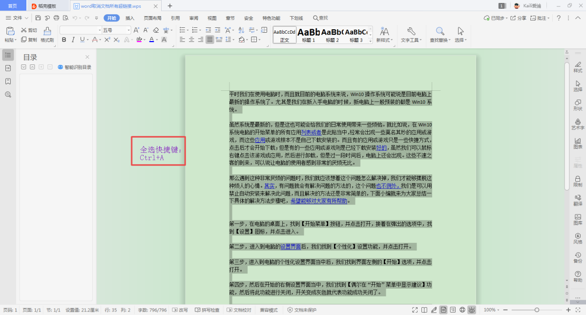 第四步,文章的全部内容选择好以后,我们按下键盘上的【Ctrl+Shift+F9】快捷键,就可以快速的取消文章中的所有超链接了。