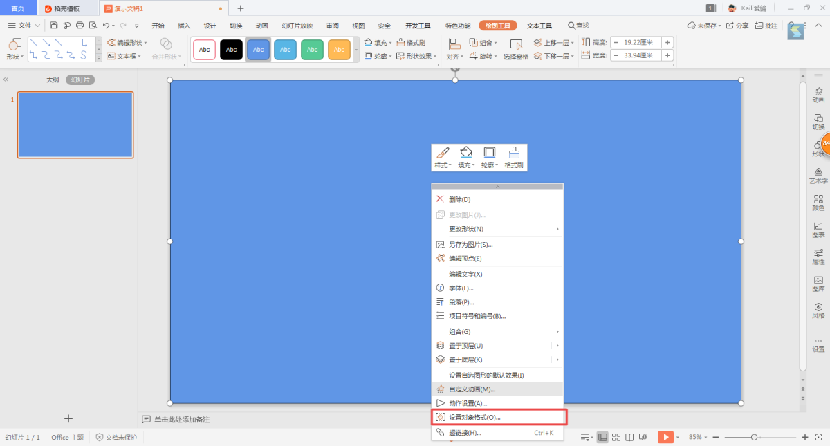 第四步,矩形绘制完成后,单击鼠标右键,在弹出的下拉选项框当中,选择【设置对象格式】功能。