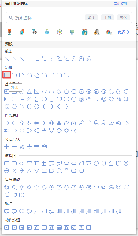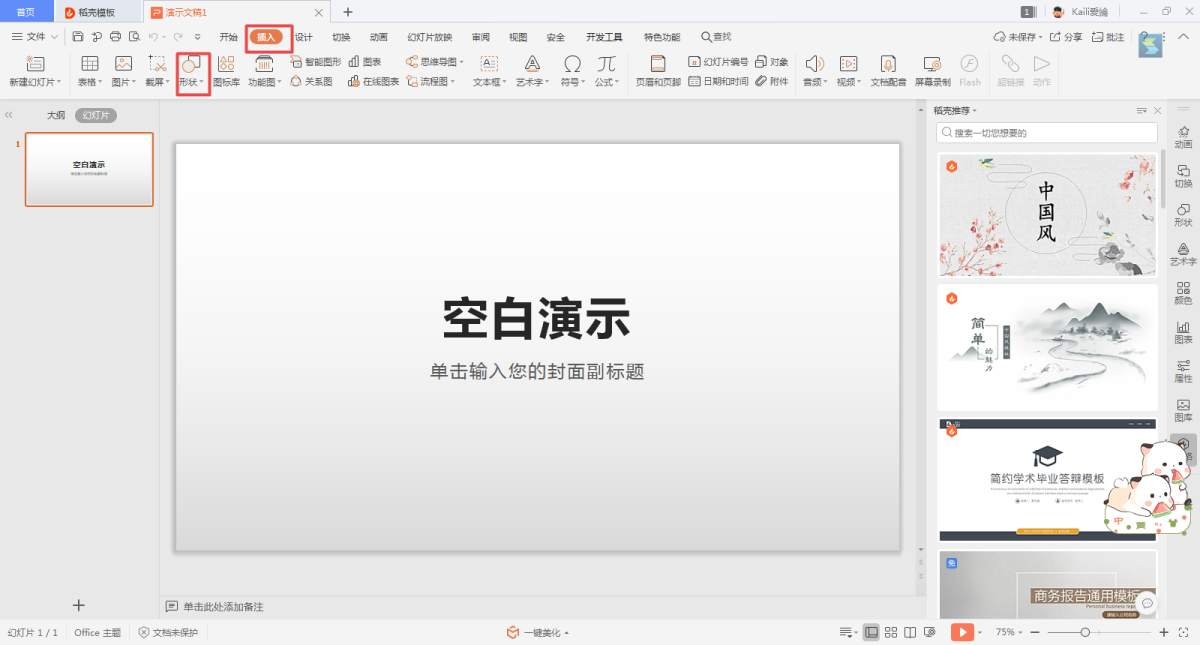 第二步,进入到PPT的界面当中后,找到工具栏上的【插入】——【形状】功能,然后选择【矩形】图形。