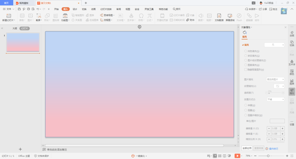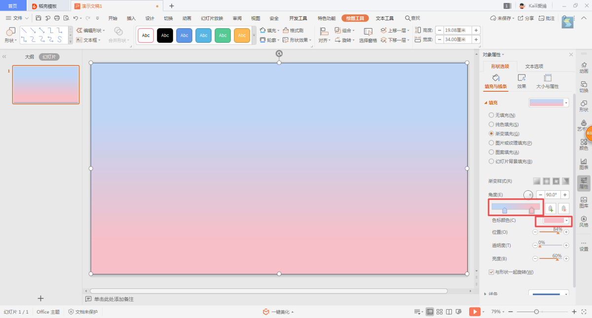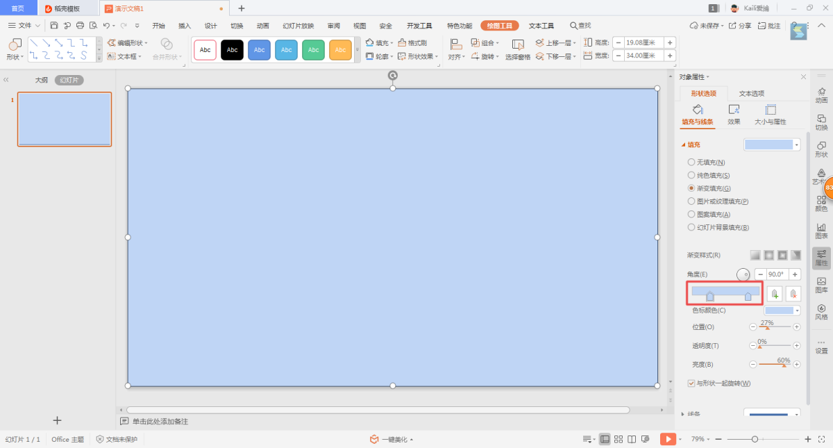 第五步,此时,PPT界面的右侧就会出现对象属性的设置窗口,在窗口中找到【线条与填充】下的【填充】选项,然后勾选【渐变填充】选项。