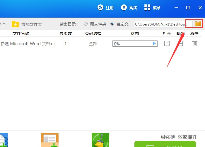 第四步,Word文档添加到软件内之后,可以对转换之后的文件存储位置进行修改。勾选【自定义】选项,然后点击页面右上角的【文件夹图标】修改即可,文件默认存储位置为【原文件夹】。
