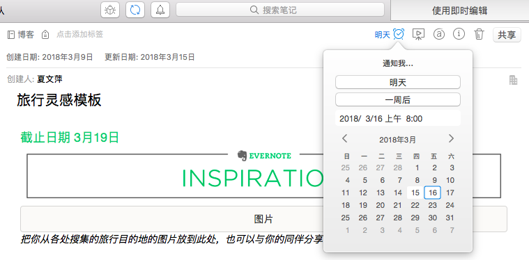 当管理多个项目时,印象笔记的提醒和设置日期功能非常有用。只需点击笔记右上方的闹钟图标,再添加日期就可以了,非常简单。添加提醒后,就可以在笔记本中的笔记列表上方看到所有已设置提醒的笔记。