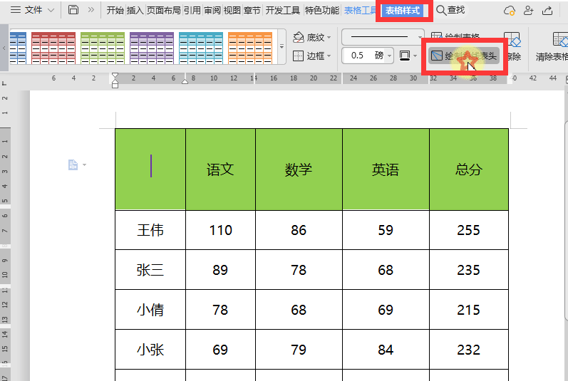 第二步,点击工具栏上的【表格样式】下面的【绘制斜线表头】选项。