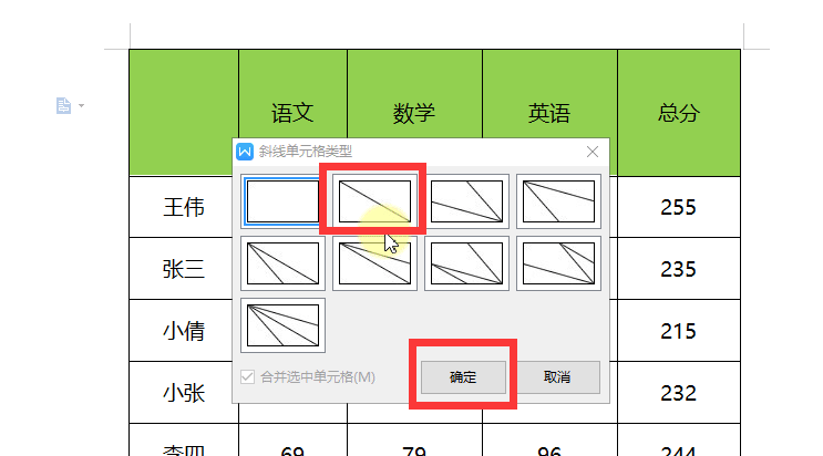 第三步,在新弹出的对话框中,选择需要的斜线表头样式,点击【确定】就斜线表头就有了,直接输入文字即可。