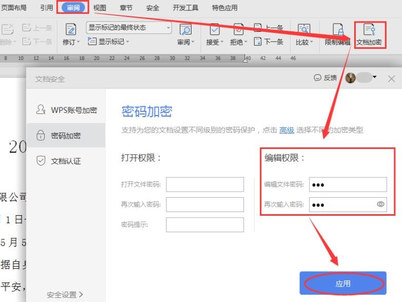 选择“密码加密”,在“编辑权限”下输入编辑文件密码,设置好后,点击“应用”。