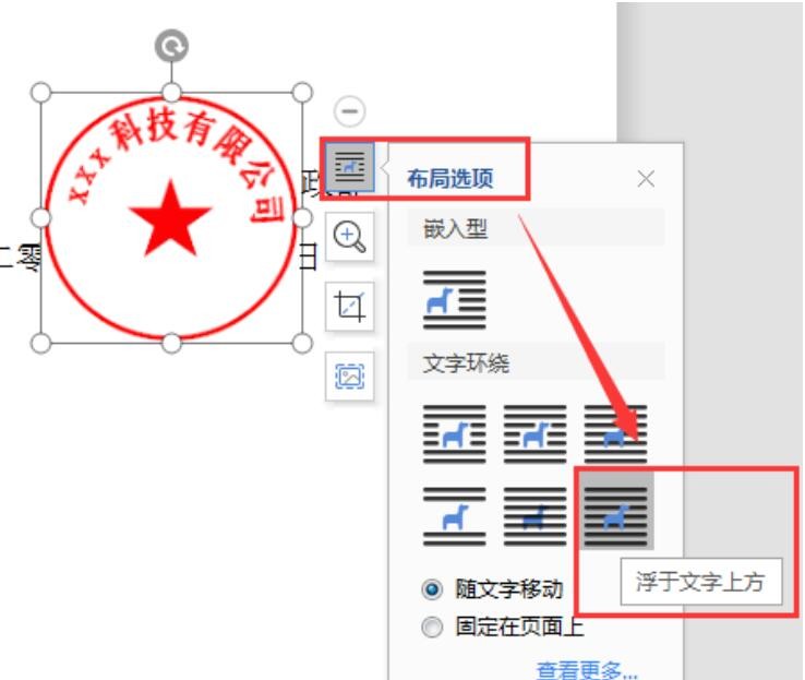 ■点击图片,此时旁边出现了几个按钮,点击“布局选项”图标,选择“浮于文字上方”,再将印章拖动到落款文字