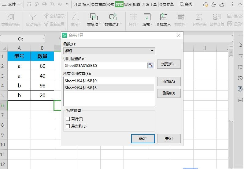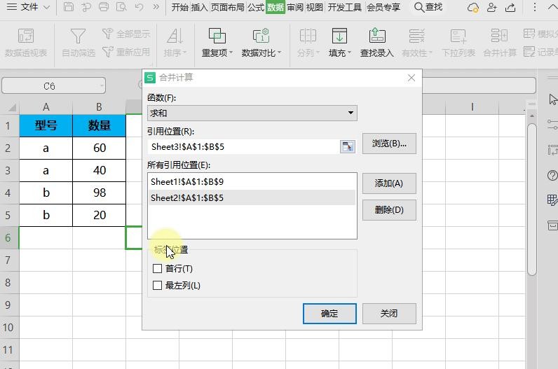 在弹出的「合并计算」对话框,函数处可以选择汇总计算类型,以「求和」为例。