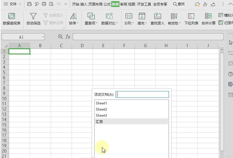 ▪鼠标放至A1单元格,依次点击「数据」选项卡-「合并计算」按钮。