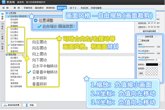 添加完视频后,界面顶部选择“画面风格”面板,左侧栏切换到“画面”,选中“自由缩放(画面裁剪)”功能。在面板中部的效果设置处,可以对画面进行缩放、移动等调整。还可以结合“向左摆动”、“向右摆动”等画面风格,对画面进行倾斜,角度可自行调整。