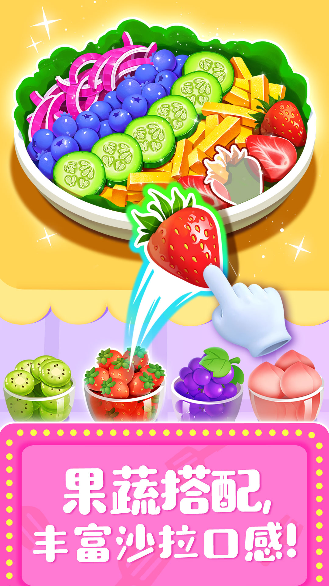 宝宝可以同步“开工”做果汁,草莓、蜜桃、柠檬等水果已切块,宝宝只需将切块放入榨汁机——“嗡嗡嗡”,可口的果汁即刻完成!