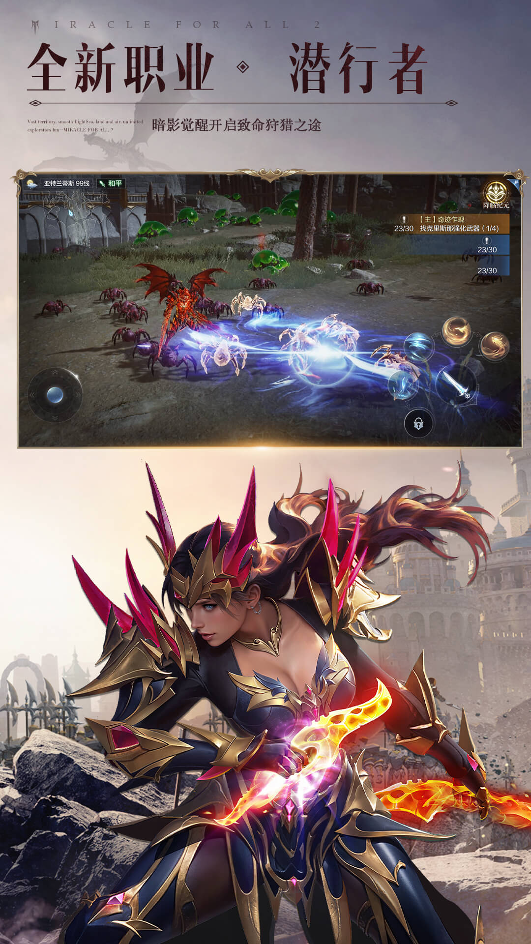 全民一起玩,才是真奇迹!《全民奇迹2》是一款腾讯旗舰级魔幻华丽手游。穿梭在UE4引擎演绎的华丽魔幻大世界里,身临其境般的沉浸体验。去感受,乘风翱翔展翅冲刺,掠过水面疾行在汹涌波涛中,体验海陆空三栖的无束缚探索;去战斗,具有魔法韵味的炫目技能,让每一次战斗都变成一场视觉盛宴;去成长,享受独特铠甲美学和流光羽翼的绚丽魅影。在这里,一起解禁你的无限魔幻想象。