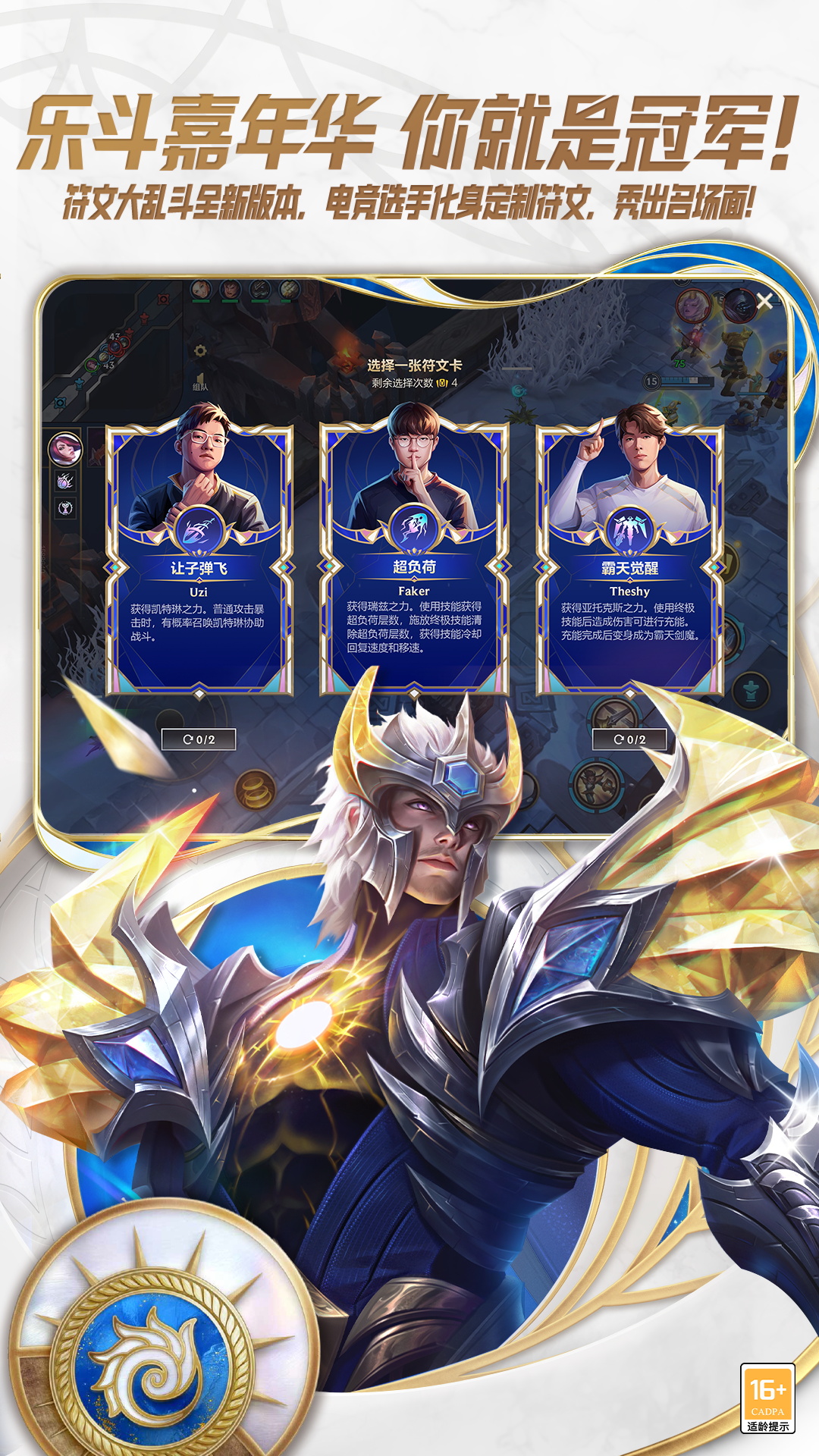 【金辉凯歌 S19赛季】《英雄联盟手游》全新版本开启!电竞热门英雄,奈德丽、芮尔、克格莫将陆续降临峡谷,为战局注入更多战术可能。S19赛季开启,排位得尼菈赛季限定皮肤冠翎征服者。重回战术原点,基石符文革新,操作决定上限,策略决定胜负。符文大乱斗联动电竞选手经典操作,秀出名场面!还有多款手游原创皮肤上新,闪耀峡谷!欢迎来到《英雄联盟手游》,感受快乐无限的游戏乐趣。