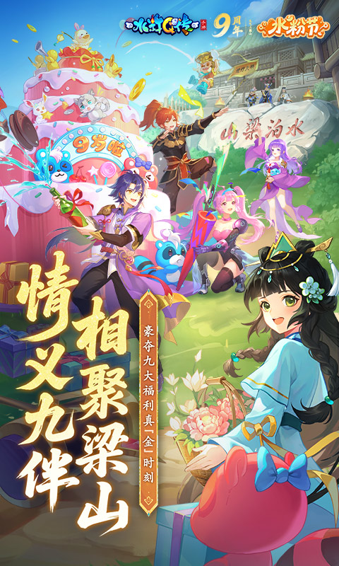 《水浒Q传》手游九周年资料片8月7日正式上线,开启首届水粉节,九大多金时刻等你探索!庆典活动抽真黄金,限定神兽小九登陆送!梁山联动财神送福,全新地图水泊梁山、元宝系列外观上新,更有新系统、新玩法、新跨服活动来袭,九周年乐趣纷呈!