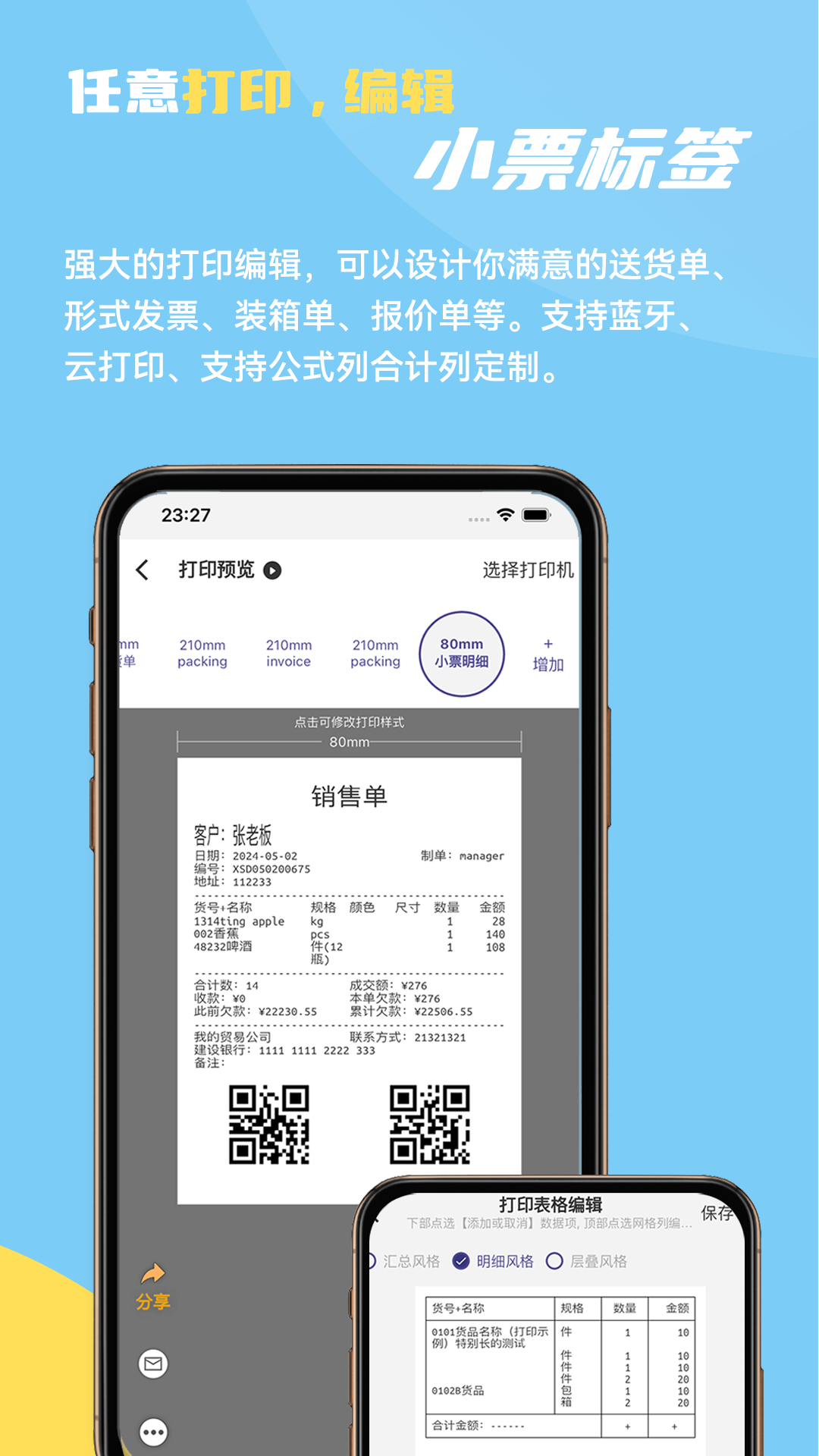 一手进销存,开单、打单、查账、查库存,实现企业多仓库调拨、多员工提成、多门店核算。支持电脑端+手机端。多语言,多币种。在线下单,补货等。
