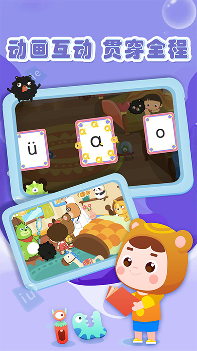 专为3-8岁孩子定制,遵从儿童认知发展规律,动画+创意互动方式引导孩子主动学、轻松学,63个拼音小怪物形象,有趣好记;智能AI语音测评书写识别,让孩子主动发音,学会书写。还有丰富原创的动画剧情和强大的学习功能丰富学习体验,为孩子的拼音学习打下坚实的基础。