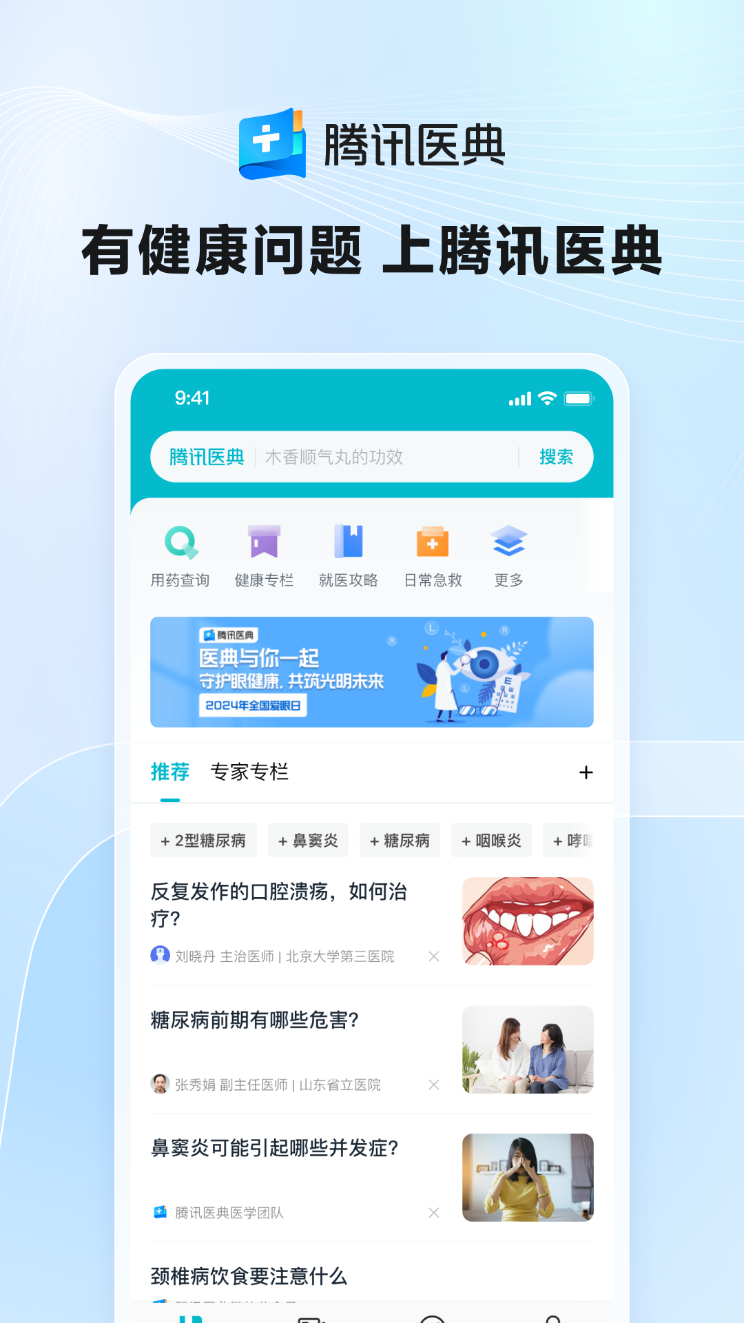 为大众而生的专业医典,腾讯医典是专业准确、又易懂实用的“百科全书”式医学科普知识资讯平台,为你在繁杂的医疗信息里提供专业可信赖的医学知识。独家引进Webmd等海外优质医学健康内容,提供疾病的症状病因诊断治疗预防等医疗百科。科普内容由专家委员会主导编撰与审核,通过视频、资讯、问答、漫画等形式让艰涩的医疗信息一目了然。 腾讯医典为用户提供线上直播有问必答、疾病概述、科普文章、专家视频、知识问答、急救、患者交流社区等,推动医学健康科普发展。