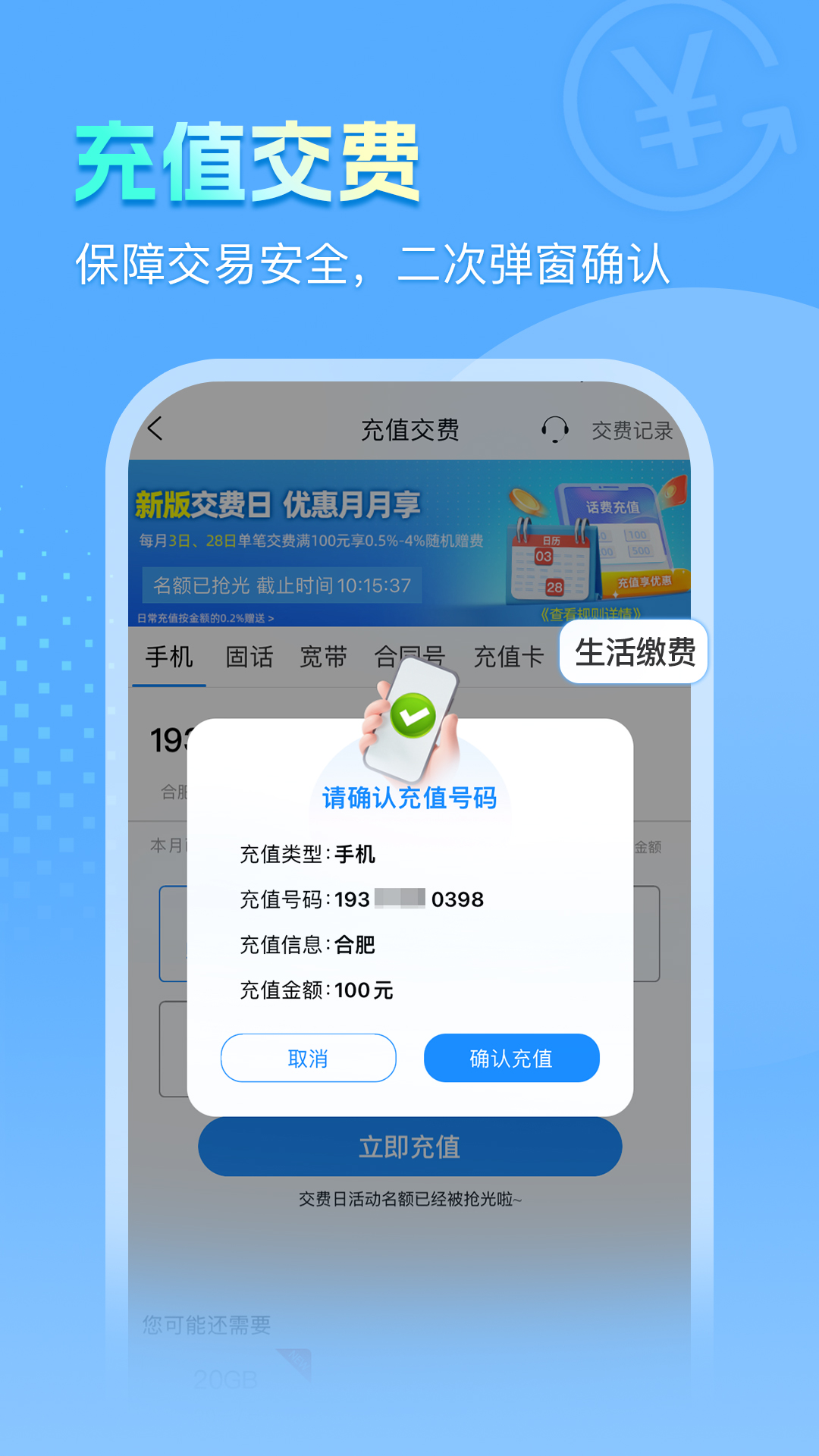 2、快速安全:便捷加流量、交话费、办业务、积分兑换;