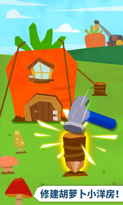 兔子姐姐爱吃萝卜,那就给它建栋萝卜洋房!操作吊车,拔出地里的大萝卜,用绳子将它拴紧在木桩上,洋房的“地基”就打好啦。