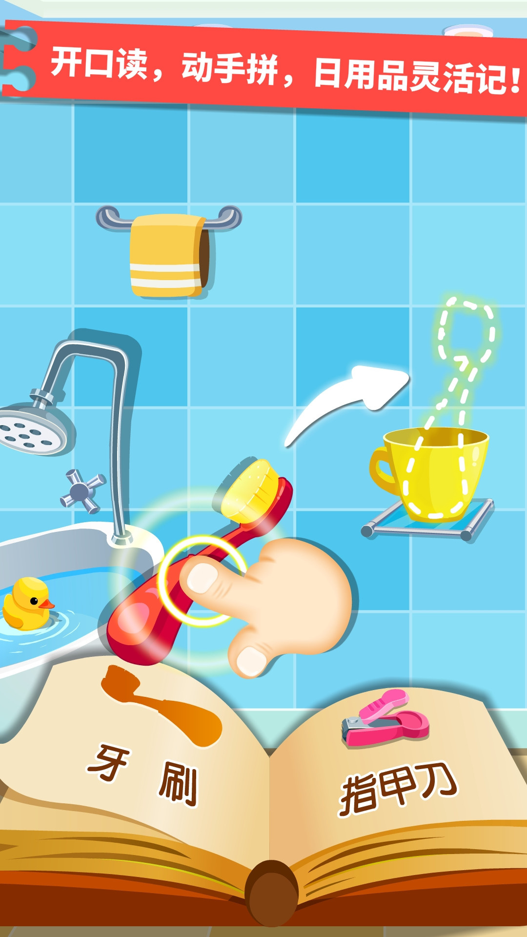 读音+图形,全面认识日用品;趣味小互动,锻炼宝宝动手能力。