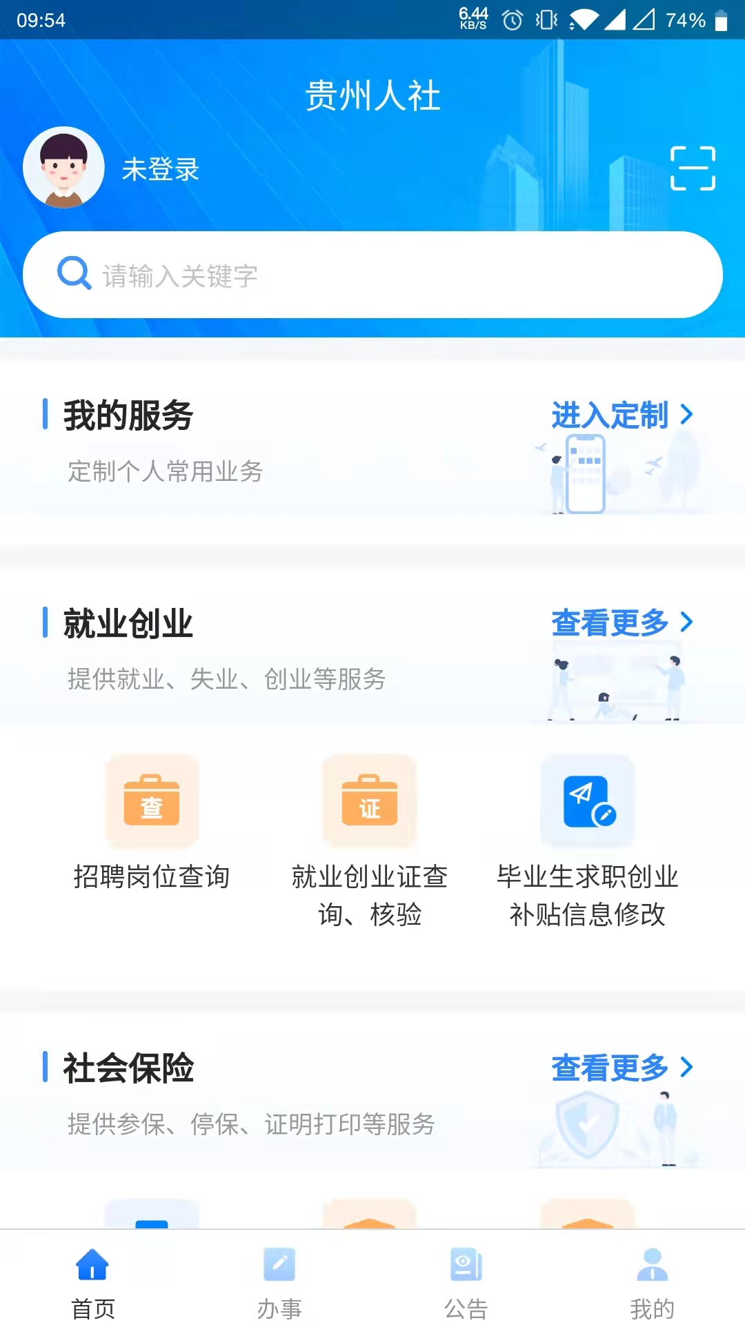 贵州人社公共服务平台移动服务,业务包含社会保险,就业创业,人才人事,劳动关系,社会保障卡等服务内容。能够快速的在线办理相关业务,方便快捷。