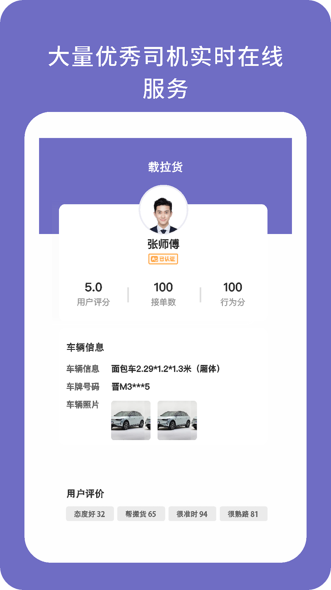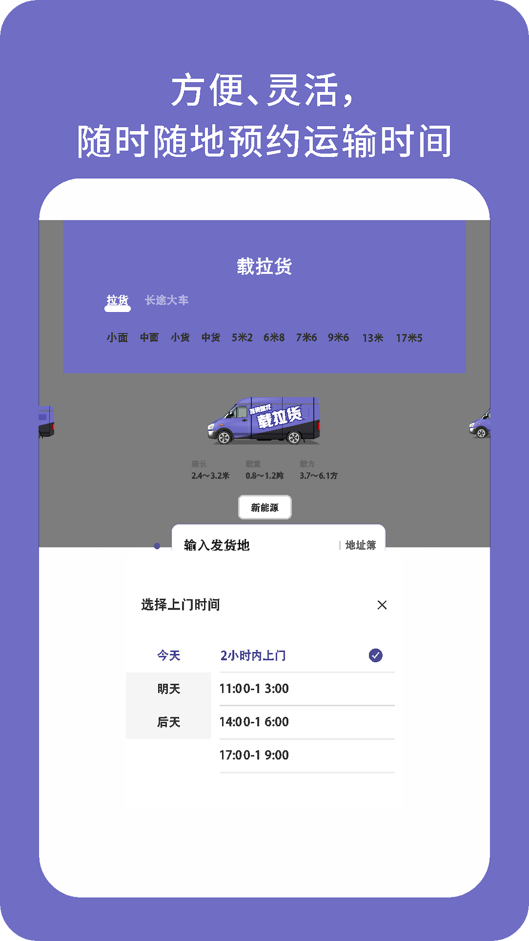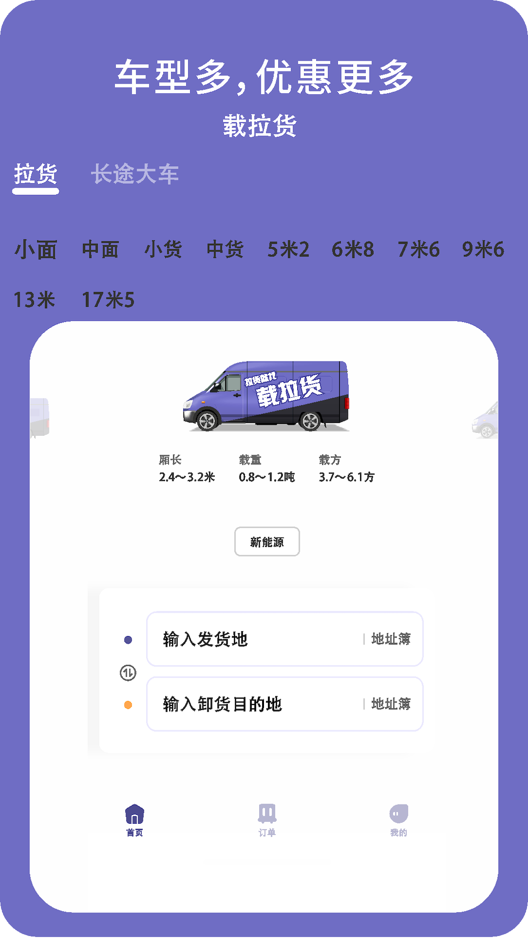 载拉货是一家互联网货运撮合平台提供一键式叫车服务,平台从小面包车到17.5米大货车多种车型满足用车需求,提供门对门的零担整车运输服务,让货主省时,省成本更省心、轻松解决您的用车需求