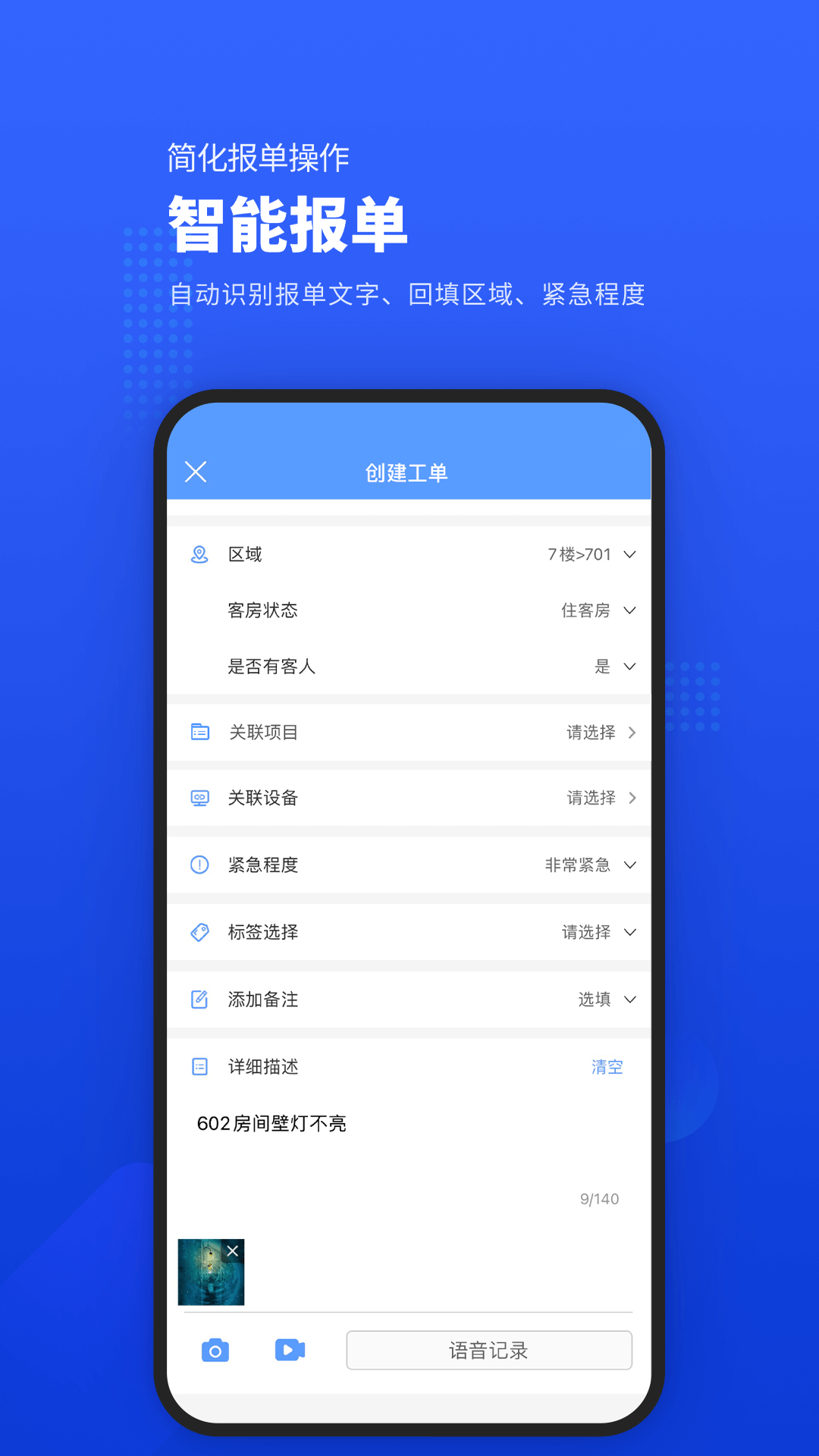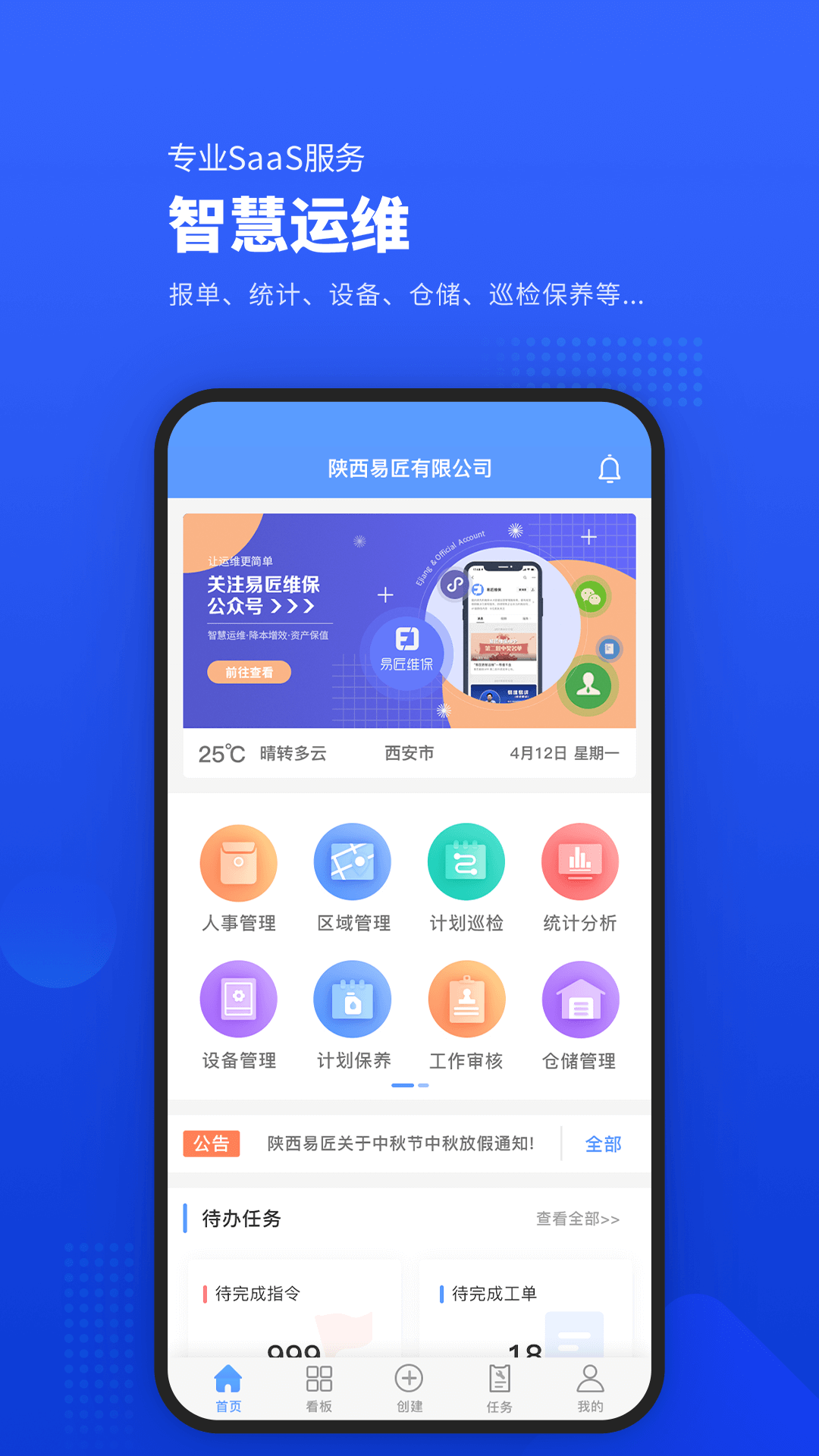 易匠维保APP是一款以ITSS标准为指导,为酒店、物业、景区、高校、医院提供专属SaaS(工程)运维服务管理软件。通过工单、工作看板、任务、人事管理、区域管理、计划巡检、统计分析、在线培训、设备管理、工作审核、亲情服务、抄表、计划保养、仓储管理、合同管理、服务平台等功能为企业实现全场景一体化的智慧运维系统,从而达到智慧运维、降本增效、资产保值的高品质运营目的。