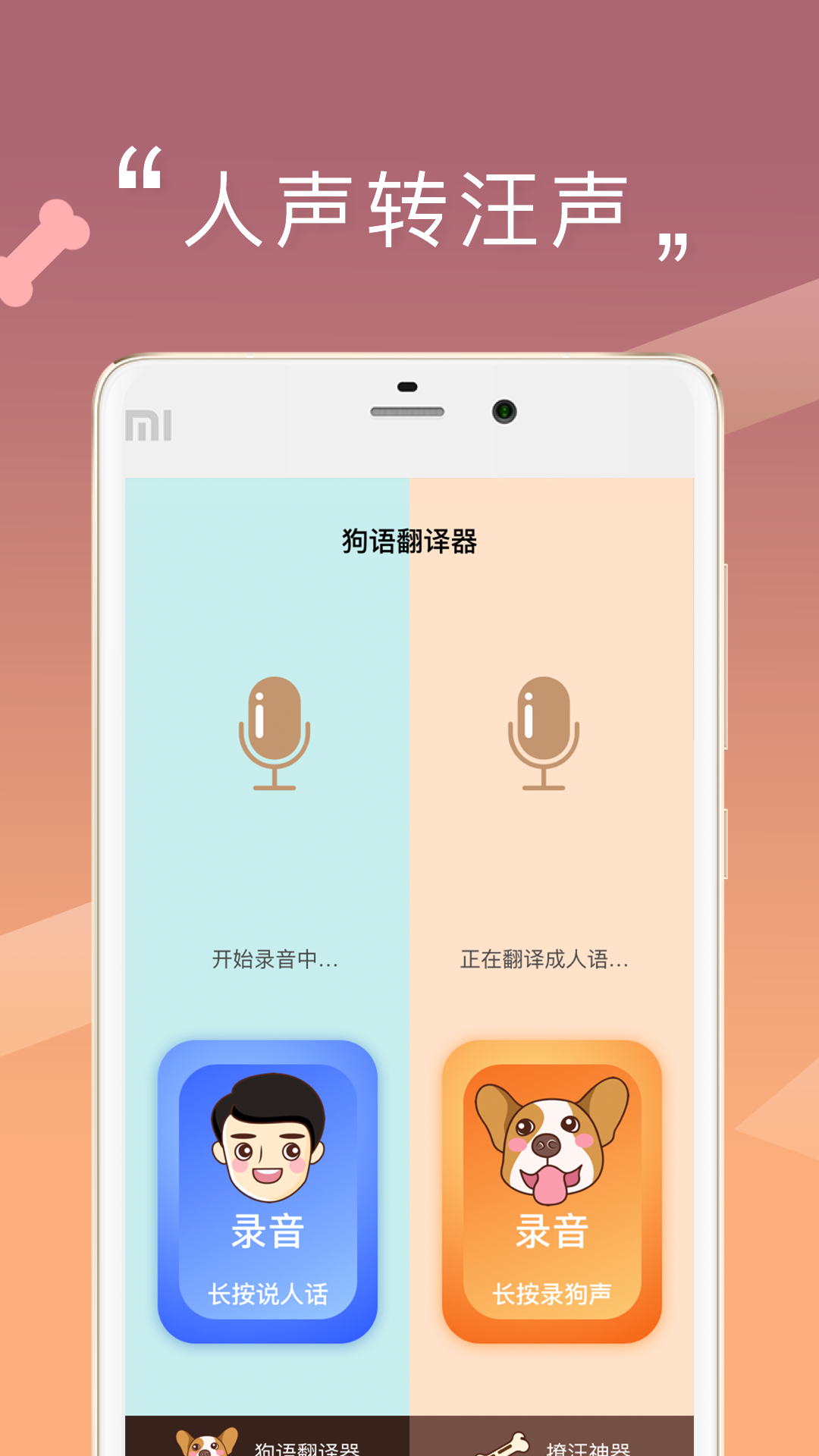 狗狗在想什么?狗语翻译人狗交流器 即时将你的声音变换为狗语翻译,获得狗狗的注意力,聆听狗狗翻译心声狗狗助手。 凭借对超过 100只狗狗的超过 1000 个高品质采样,即使是脾气最火爆、最性格乖戾的狗狗,人狗交流器也能将它打动。 人狗交流器会真正对你的声音进行音频分析(真的如此)并根据你的输入复述出小心变声的狗叫声。 人狗交流器还包括一个带有多种狗叫声的音板,轻松人狗交流翻译器狗助手,狗狗语翻译神器助手