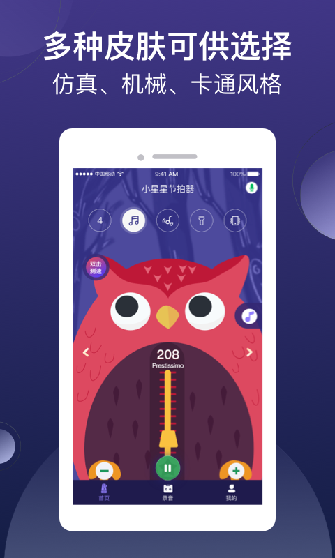 提供仿真模式、极简模式、猫头鹰模式皮肤,多种皮肤可任意切换,让弹奏更有趣;